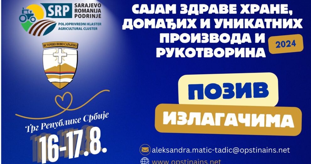 У оквиру манифестације „Љето у Источном Новом Сарајеву 2024“, Општина Источно Ново Сарајево у сарадњи са Кластером „СРП“ организује традиционални, трећи Сајам здраве хране, домаћих и уникатних производа и рукотворина, који ће бити одржан 16. и 17. августа на Тргу Републике Србије. На Сајму је планирано представљање удружења, те постојећих и будућих предузетника из цијеле […]