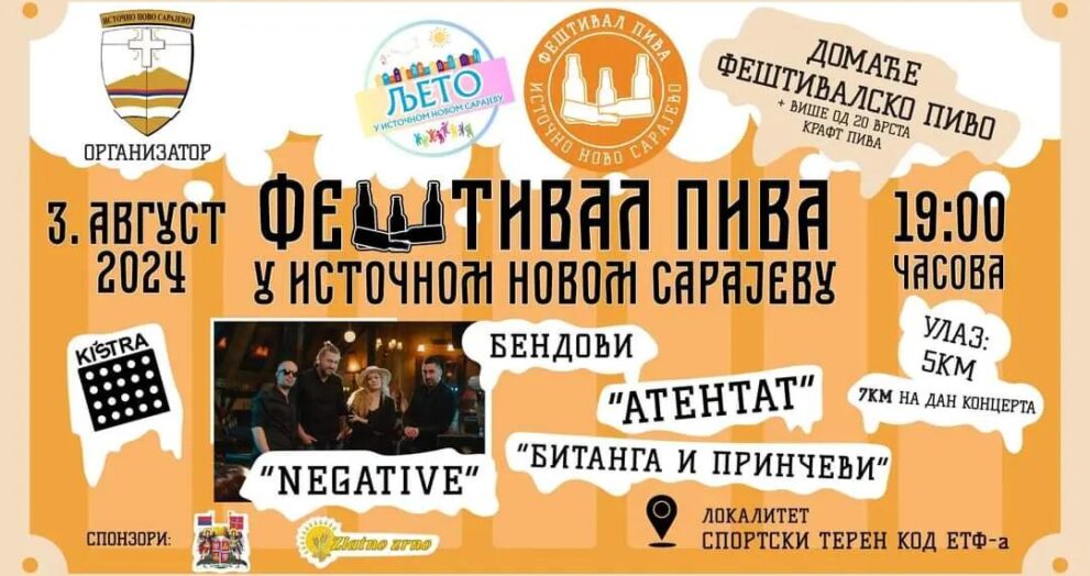 У оквиру манифестације „Љето у Источном Новом Сарајеву“ у суботу 3. августа 2024. године са почетком у 19,00 часова на локацији спортских терена код Електротехничког факултета (улица Карађорђева), биће одржан традиционални пивски фестивал „ФеШтивал пива“. У оквиру музичког дијела фестивала, наступиће бендови „Атентат“, „Негатив“ и „Битанга и принчеви“ који ће сигурно направити сјајну атмосферу својим […]