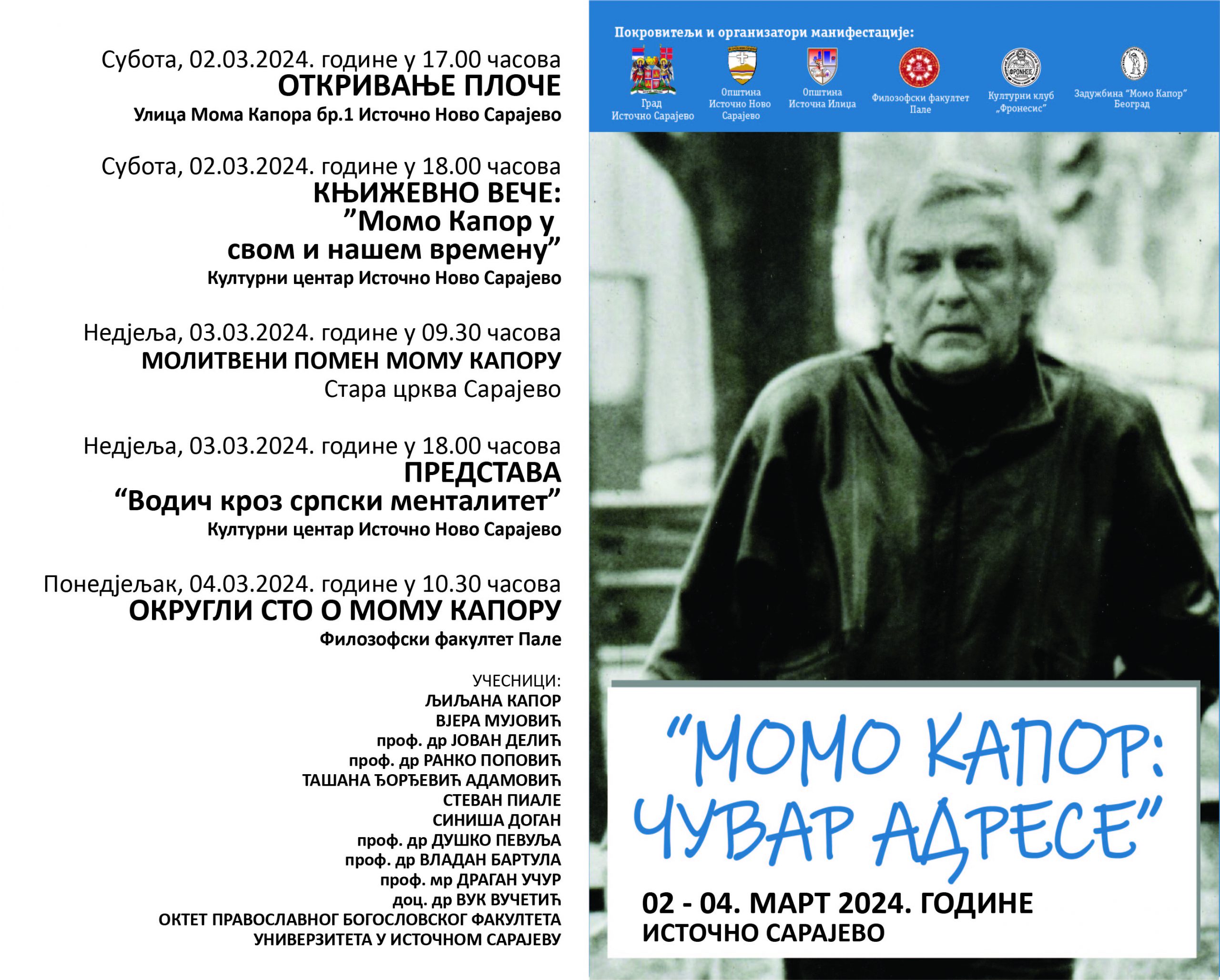 Završava za: Manifestacija “Momo Kapor: čuvar adrese”, posvećena Momi Kaporu, jednom od najvećih srpskih i sarajevskih književnika, slikara i publicista u 20. vijeku biće održana od 2. do 4. marta. Manifestacija počinje u subotu, 2. marta, u 17.00 časova, svečanim otkrivanjem spomen-table posvećene ovom velikanu u Ulici Mome Kapora broj 1 u Istočnom Novom Sarajevu, nakon čega […]