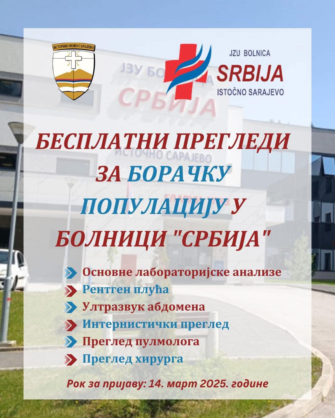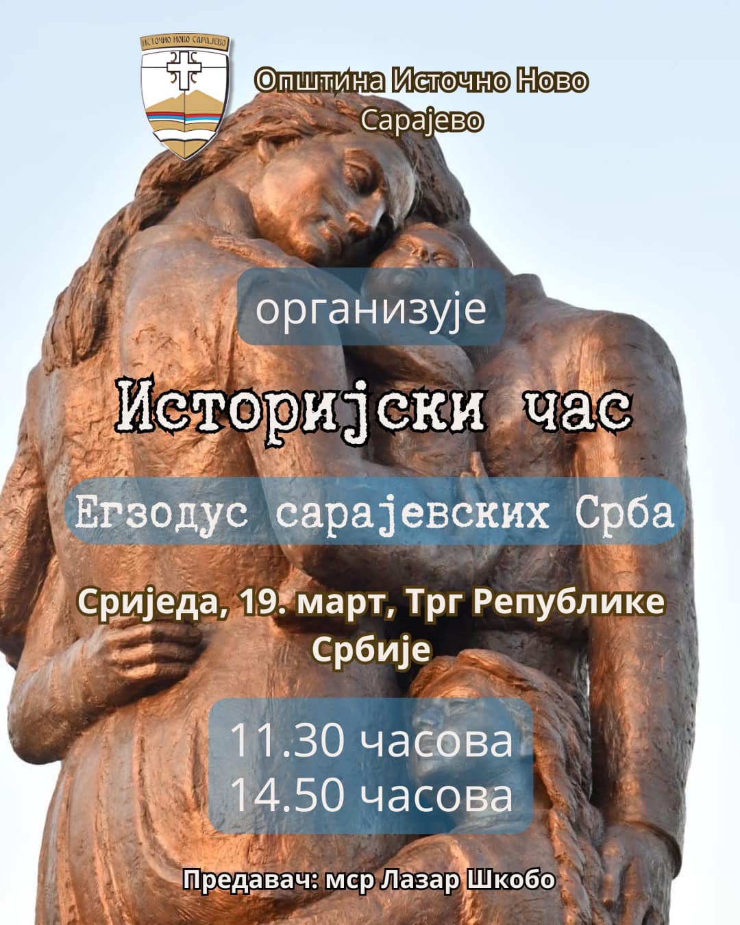Završava za: Povodom 29. godišnjice najvećeg egzodusa u Evropi, Opština Istočno Novo Sarajevo organizuje istorijski čas posvećen žrtvi sarajevskih Srba. Srijeda, 19. mart Trg Republike Srbije 11.30 časova 14.50 časova Predavač: msr Lazar Škobo Cilj ovog časa je podizanje svijesti mladih o značaju egzodusa sarajevskih Srba za izgradnju Istočnog Sarajeva, Republike Srpske i mirnog i dostojanstvenog života […]